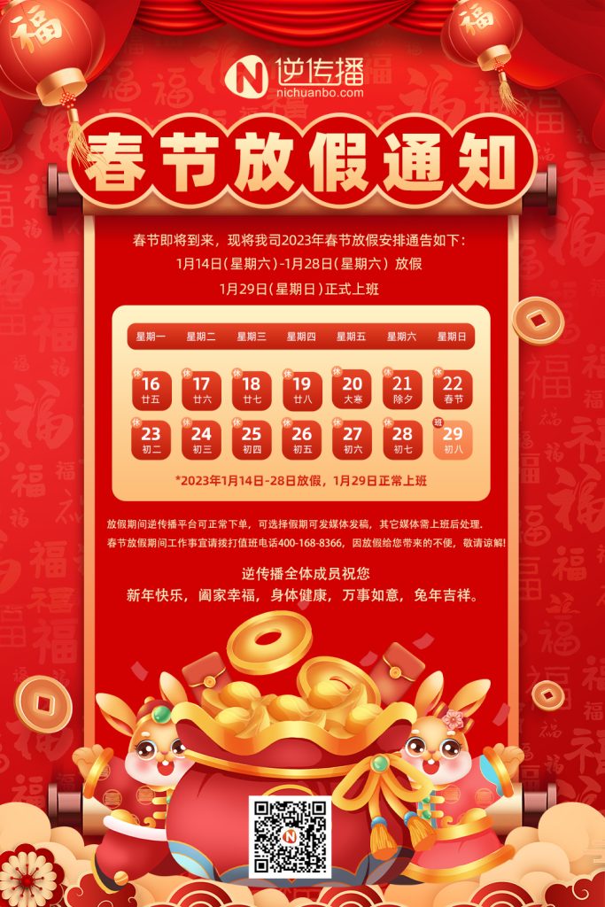 三、放假期间逆传播平台(www.nichuanbo.com)可正常下单(上班后第一时间处理)。
